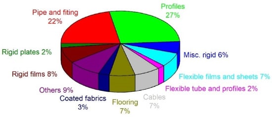 The use of PVC in the European Union, broken down into applications, is shown in Figure 1. Approximately 70% of PVC output is employed in the construction industry, mainly as window and door profiles, water and sewage pipes, cable insulations, gutters, floor lining, and roof membranes [14].