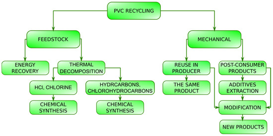 The basic PVC recycling system is schematically shown in Figure 2. PVC can be subject to both mechanical recycling processes and feedstock recycling.