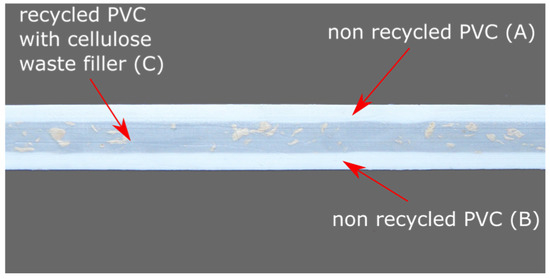 The mixture of PVC waste with various compositions is also suitable for recycling. It is possible to successfully obtain a material with satisfactory mechanical properties. Additionally, the possibility of PVC modification using a wide range of process grease and fillers allows us to optimise the composition of the blend in terms of the rheological properties. Thus, it is possible to produce multilayer products in the process of co-extrusion. The core of such a profile is made up of a modified recyclate, while the outer layers, which contain virgin PVC, provide specific functional and visual properties, as well as reinforce the recyclate layer with lower mechanical properties [40].