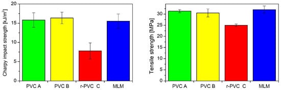 Comparison of the mechanical properties of recycled PVC (C) and non-recycled PVC (A,B) with the multi-layer material made of them (MLM) (errors bars represent standard deviation).