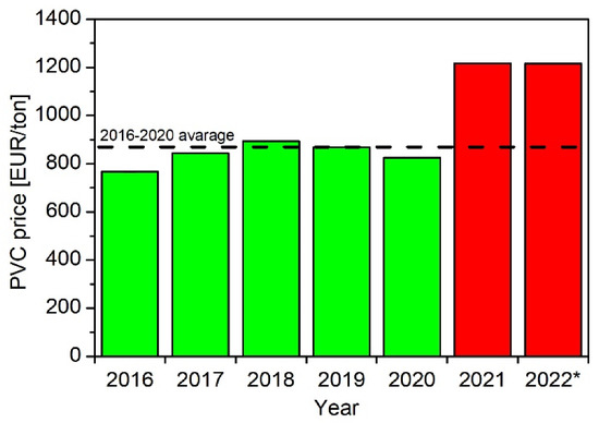 Figure 7 shows average PVC forward-purchase prices on the stock exchange (DPVc1 indexed on Dalian Commodity Exchange) after converting into EUR/ton at a rate on the listing date [129,130]. The PVC price in the years 2016–2020 was stable, and the average for that period amounted to EUR840 per ton. However, the market recorded a sudden increase in the price of this raw material in 2021. The average price for 2021 and 2022 (January–June) was already EUR1216 per ton, which is a 45% increase relative to the previous 5-year period.