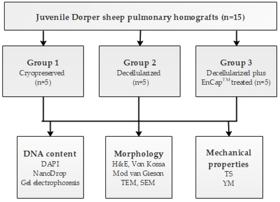 Pulmonary homografts harvested from juvenile Dorper sheep (n = 15), with a post-mortem cold ischaemic harvesting time of 48 h, were divided into three groups: Group 1, cryopreserved (n = 5); Group 2, decellularized (n = 5); and Group 3, decellularized plus EnCapTM-treated (n = 5). After processing, the structural integrity, strength, and elasticity of the leaflet and wall tissue were evaluated and compared. Strength and elasticity analysis included tensile strength (TS) and Young’s modulus (YM), and morphological evaluation included DAPI staining to confirm decellularization, hematoxylin and eosin staining (H&E), von Kossa staining, modified Verhoeff’s van Gieson staining, scanning electron microscopy (SEM), and transmission electron microscopy (TEM). A schematic representation of the study design is given in Figure 1. The interfaculty Animal Ethics Committee of the University of the Free State (UFS-AED2016/0101) approved the study.