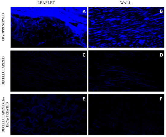 Representative images of DAPI-stained sections of cryopreserved (n = 5) (A,B), decellularized (n = 5) (C,D), and decellularized plus EnCapTM-treated (n = 5) (E,F) leaflet and wall tissue.