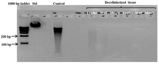 Representative gel electrophoresis image demonstrating the absence of DNA material in leaflet, wall, and muscle tissue of homografts after decellularization. (Standard (Std) = Lamba DNA; control = fresh homograft tissue).