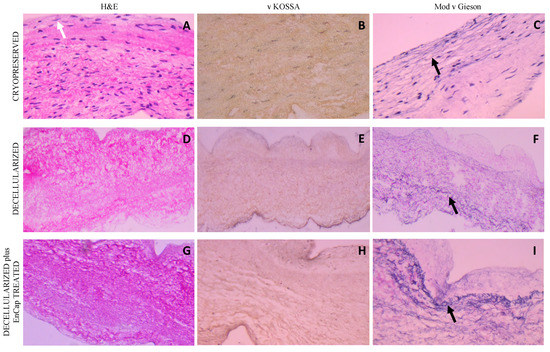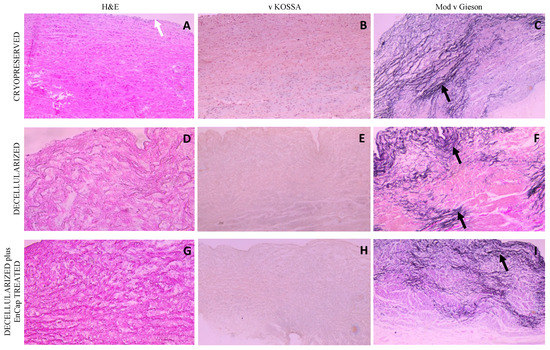 Representative H&E, von Kossa, and modified Verhoeff’s van Gieson staining of cryopreserved, decellularized, and decellularized and EnCapTM-treated wall tissue processed after 48 h cold ischemia; white arrow points to endothelial layer, and black arrows point to normally distributed elastic fibers ((A–I) = 100× magnification).