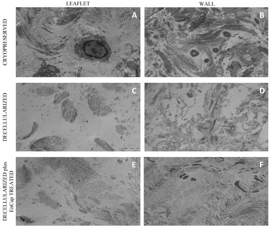 Representative transmission electron microscopy images of cryopreserved, decellularized, and decellularized and EnCapTM-treated wall tissue processed after 48 h ischemia ((A–F) = scale bar 2 µm).