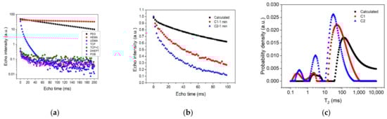Transverse NMR relaxation measurements were performed using a low-field instrument (Minispec MQ20, Bruker, Karlsruhe, Germany) operating at a 20 MHz proton resonance frequency. The measuring temperature was set at 35 °C; close to body temperature. The well-known Carr–Purcell–Meiboom–Gill (CPMG) [] pulse sequence was implemented for performing the measurements. The CPMG pulse sequence consisted of a series of 180-degree radiofrequency (RF) pulses following a single 90-degree RF pulse. This sequence generated a train of spin echoes, separated by an echo time interval, . The amplitudes of these echoes were attenuated by transverse relaxation phenomena. In the case of a heterogeneous sample, consisting of separate spin reservoirs, which are characterized by distinct transverse relaxation times, T2, the n-th echo in the echo train attenuated according to the following formula: