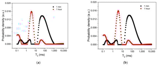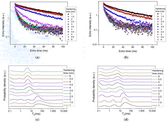 To monitor the acceleration effects introduced by the presence of chitosan on cement hardening, multiple CPMG echo trains were recorded on each sample at 30 min intervals. The results are depicted in Figure 2a, b, respectively. One can observe an increase in the slope of these curves during the first 3.5 min of polymerization, representing the initial setting time of the bone cement []. It was also directly observed that the two samples revealed different hardening dynamics. For a better monitoring of the chitosan effects on polymerization dynamics, we extracted from the CPMG echo trains depicted in Figure 2a,b the corresponding relaxation time distributions via a numerical Laplace inversion []. The corresponding relaxation time distributions, at different hardening times, are shown in Figure 2c,d.