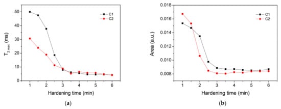Figure 3a depicts the position of the peak maximum corresponding to the most mobile component versus hardening time. One can observe a decay of the relaxation time for both samples (C1 and C2) with a plateau starting at 3.5 min, which could be considered as the final setting time of the cement material []. The presence of a plateau showed that the polymerization process almost stopped, and that there was no change inside the two samples. When we analyzed the T2 values, we noticed smaller relaxation times for the sample containing chitosan (C2) as compared to the sample without chitosan (C1). According to Equation (2), this behavior could be attributed to smaller pores forming inside the C2 sample as compared to the C1 sample.