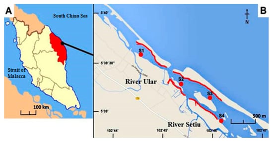 Map showing (A) Setiu Wetlands location at the east coast of peninsular Malaysia (facing South China Sea), and (B) Sampling stations S1–S4 at Setiu Wetland, Malaysia.