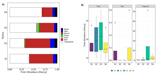 Originated from synthetic polymers, microplastics (size < 5 mm) can present in various shapes, sizes, and colors [22,35]. In this study, analyses of microplastics were separated into two parts. Firstly, physical and visual analysis, and secondly, polymer identification by chemical analysis. In the first part, the color of microplastics was sorted, followed by their type (i.e., fiber, fragment, and film). From the physical analysis, a total of 371.4 ± 20.2 items/g microplastic particles was extracted in collected polychaetes from four sampling stations. From that data, 185.2 ± 24.7 items/g are transparent microplastics (49.87%), followed by brown with 138.3 ± 13.6 items/g (37.24%), 21.7 ± 1.9 items/g for blue (5.84%), 12.9 ± 1.1 items/g for black (3.47%), 1.53% for green, 1.08% for grey, and, lastly, around 0.97% for red samples. The Kruskal–Wallis test showed that the total microplastics abundance between sampling stations was insignificantly different: H(3) = 1.51, p = 0.68. When comparing the sampling stations (Figure 2A), S1 and S2 indicated that brown microplastics were dominantly found in collected worms, followed by transparent, blue, black, and other colors of microplastics. However, in sampling sites of S3 and S4, the transparent color is the most dominant color among the microplastic found in polychaete samples, followed by brown, blue, black, and others.