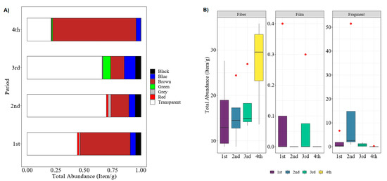 Meanwhile, Figure 3 indicates the total abundance of microplastics in polychaetes in four different sampling periods of November 2015 (1st), March 2016 (2nd), August 2016 (3rd), and January 2017 (4th) in term of colors (Figure 3A) and shapes (Figure 3B). During the first sampling period, the northeast monsoon was blown in the Setiu Wetlands and caused a heavy rainy season from November to January [41]. Generally, the movement of pollution agents into river streams was positively affected by the amount of rainfall. Therefore, when sampling activity happened in the second sampling period in March (post–northeast-monsoon), the number of microplastics increased by approximately 41.62% compared to the first sampling period. Interestingly, the most abundant microplastics found were transparent during the second and third sampling periods, while the brown microplastics became dominant when it was close to the northeast monsoon season. However, Kruskal–Wallis confirmed that there was an insignificant difference in terms of the total microplastics abundance between the sampling period, even with the variation in specific color observed: H(3) = 0.86, p = 0.834.