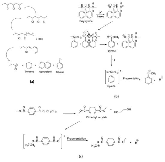 Simplification of degradation mechanism of common polymers into respective monomers: (a) PVC, (b) PS, and (c) PET.