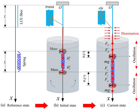 To analyze the inhomogeneous deformation of LCE fiber, we established a Lagrangian coordinate system on the reference state of LCE fiber, and the Eulerian coordinate system in its current state. Then, the instantaneous position of a material point can be denoted as . During the movement of coupled oscillator, the governing equation for the dynamics of two mass blocks can be given by