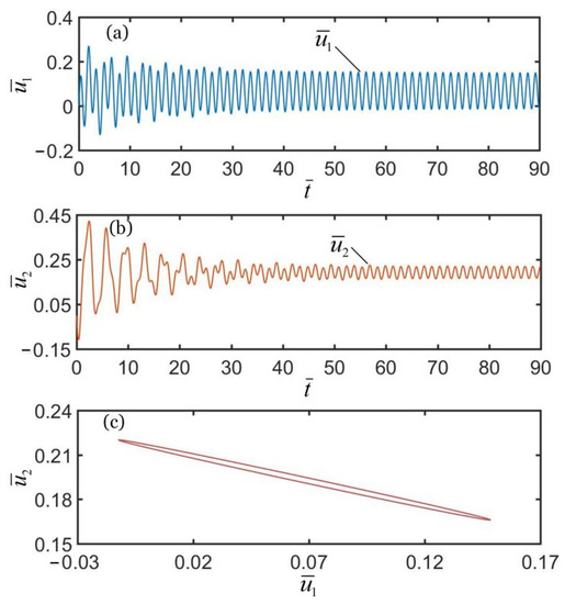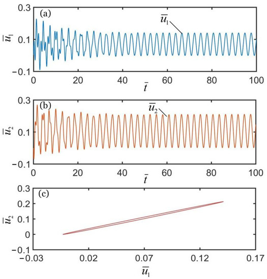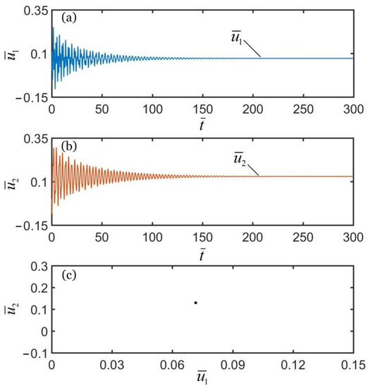 To investigate the synchronous motion of the two coupled oscillators, the typical geometric parameters and material properties were estimated for numerical calculations. According to the available experiments [10,66,67,68,69,70], we list typical values of geometric parameters and material properties of the coupled oscillators system in Table 1. Meanwhile, the corresponding dimensionless parameters are also listed in Table 2. In addition, we set the initial velocities of two mass blocks as and . Figure 2, Figure 3 and Figure 4 show the displacement time histories of the two mass blocks and the attraction domain for three different spring constants . In the computation, the other geometric and material parameters are given in Table 2. As shown in Figure 2a–c, the numerical results show that the two mass blocks always move in the same direction during the self-oscillations for . This means that the two oscillators are in-phase regime. As shown in Figure 3a–c, the numerical results show that the two mass blocks always move in opposite directions during the self-oscillations for , which indicates that the two oscillators are in anti-phase regime. Meanwhile, as shown in Figure 4a–c, the two oscillators finally develop into static regime for . In summary, there are three typical synchronous regimes for the self-sustained motion of the two mass blocks, namely, in-phase regime, anti-phase regime and static regime. Detailed numerical calculations show that the synchronous regime of self-oscillations is mainly determined by the spring constant. In the following, we further explore the mechanisms of the in-phase and anti-phase regimes and the effects of several key parameters on their amplitudes, periods, limit cycles and attraction domains.