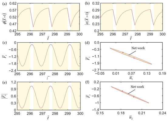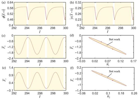 As shown in Figure 5, to study the mechanism of self-excited oscillation in the in-phase regime of two oscillators under steady illumination, the relationship diagrams of some key physical quantities in the in-phase regime in Figure 2 are given. The shadow area in the figure indicates that LCE fiber is in the illuminated region. During the oscillation of the upper mass block, the cis-number fraction of the material point at the end of the LCE fiber increases in the illuminated region and decreases in the non-illuminated region, as shown in Figure 5a. As a result, light-triggered contraction increases in the illuminated region and decreases in the non-illuminated region, as shown in Figure 5b. Since the number fraction of LCE fibers and the photo-triggered contraction show periodic changes, the spring force magnitude of LCE fibers first increases and then decreases in the illuminated region, as shown in Figure 5c. In Figure 5d, the spring force of the LCE fiber and the displacement of the upper mass block shows a closed-loop relationship, and the area enclosed by the closed-loop represents the net work done by the force. Under the action of periodic contraction and relaxation of the LCE fiber, the spring force magnitude of the spring also shows periodic changes, as shown in Figure 5e. In Figure 5f, the spring force of the spring and the displacement of the lower mass block show a closed-loop relationship, and the area enclosed by the closed-loop represents the net work done by the force. Once the net work of the spring force is equal to the energy consumed by the damping of the lower mass, its self-excited oscillation can be maintained. Since the two mass blocks can attain self-excited oscillation respectively, and because , the coupling between the two mass blocks is strong, and the synchronous motion regime of the coupling oscillator is in-phase.