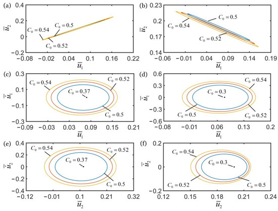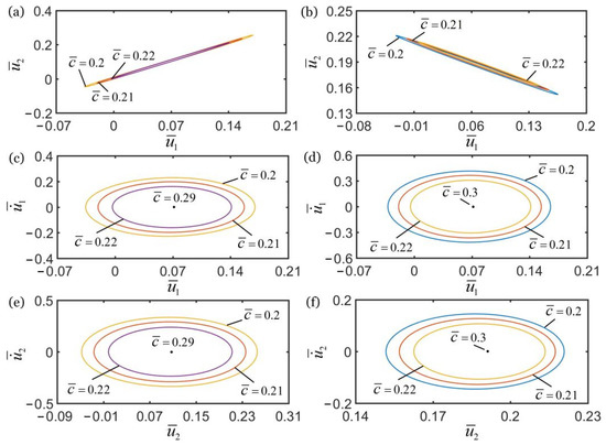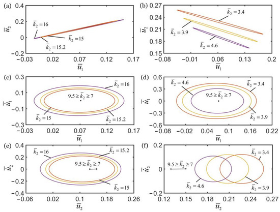 Figure 9 shows the effect of the contraction coefficient on the self-oscillations of two oscillators for the in-phase regime of and the anti-phase regime of . In the computation, the other geometric and material parameters are given in Table 2. It can be seen from Figure 9a,b that the contraction coefficient does not affect the synchronization regime of the two oscillators. In the in-phase regime, the amplitudes of self-oscillations of two oscillators gradually decrease with the decrease of contraction coefficient, and the limit cycles finally evolve into the static regime, as shown in Figure 9c,e. The self-oscillation of the two oscillators can be triggered for , while the oscillation regime is eventually suppressed for . In the anti-phase regime, it can be seen that for , with the increase of contraction coefficient the amplitude of self-oscillation increases gradually. However, for , the limit cycles evolve into the static regime, which is denoted by the point in Figure 9d,f.