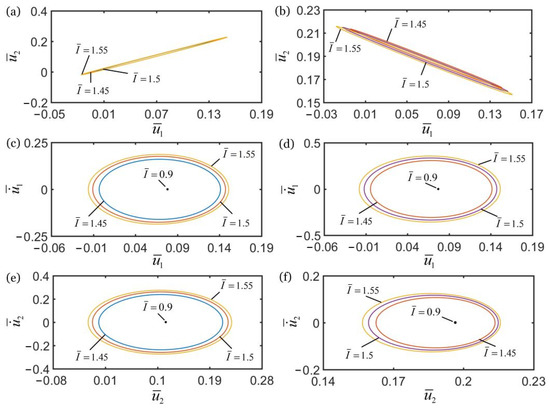 Figure 10 shows the effect of light intensity on the self-oscillations of two oscillators for the in-phase regime of and the anti-phase regime of . In the computation, the other geometric and material parameters are given in Table 2. The numerical results show that the light intensity does not affect the synchronization regime of the two oscillators, as shown in Figure 10a,b. In the in-phase regime, the amplitudes of self-oscillations gradually decrease with the decrease of light intensity, and the limit cycles finally evolve into the static regime, as shown in Figure 10c,e. This shows that the self-oscillation of two oscillators can be triggered for , while the oscillation regime is eventually suppressed for . In the anti-phase regime, it can be seen that for , with the increase of light intensity, the amplitudes of self-oscillations increase gradually. However, for , the limit cycles evolve into the static regime, as shown in Figure 10d,f.