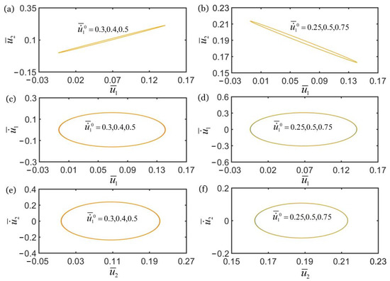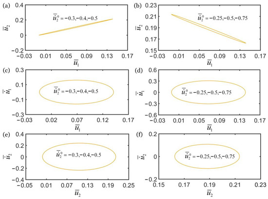 Figure 11 shows the effect of initial velocity on the self-oscillations of two oscillators for the in-phase regime of and the anti-phase regime of . In the computation, the other geometric and material parameters are given in Table 2. The numerical results show that the initial velocity does not affect the synchronization regime of the two oscillators, as shown in Figure 11a,b. In the in-phase regime, the initial velocity does not affect the limit cycle and amplitude of self-oscillation of two oscillators, as shown in Figure 11c,e. In the anti-phase regime, it can be seen that the initial velocity also does not affect the limit cycle and amplitude of self-oscillation of two oscillators, as shown in Figure 11d,f.