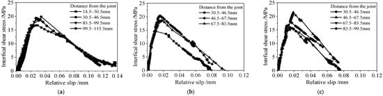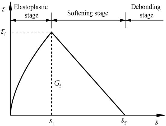 where τ is bond stress, s is relative slip, is the peak interfacial shear stress, is the slip corresponding to the peak interfacial shear stress, α is the fitting parameter of the curve rising section, is the maximum slip at interface failure. The above characteristic parameters were calibrated according to the fitting results of test data, and more details about the calculation process can be found in the authors’ recent study []: