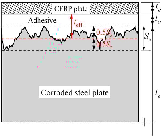 where is the tensile strength of the adhesive, is the interfacial fracture energy, is the effective adhesive thickness, which is defined as the sum of the construction adhesive thickness and the additional adhesive thickness caused by the corroded rough surface, as shown in Figure 3.