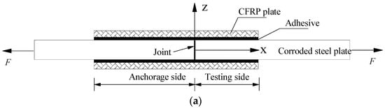 Corrosion is an almost unavoidable durability problem for many steel structures which have been exposed to long-time corrosive environments such as industry and ocean atmosphere []. To prolong the service life of corroded steel structures, compared with the possible long-term traffic interruption, production line shutdown and other economic consequences caused by the direct demolition or replacement of rusted components, the reinforcement and repair of corroded steel structures is usually a more economical and effective method. Carbon fiber reinforced polymer (CFRP) materials possess the characteristics of high strength/weight ratio as well as excellent fatigue and corrosion resistance, and the strengthening system with CFRP bonded to a steel substrate has been proved to be more efficient by minimizing the additional permanent load, eliminating stress concentration, no residual stress or new structural damage, and higher durability than the traditional repair and reinforcement methods such as welding, bolting or riveting [,]. Li et al [] tested the fatigue behavior of corroded steel plates strengthened with CFRP plates; they demonstrated that the fatigue life of the patched specimen which presented the most significant strengthening effectiveness showed a fatigue life extension of more than 85.3 times with respect to the unpatched corroded steel plate and approximately twice more than the uncorroded steel plate; the strengthening system with external bond CFRPs presented a good engineering application prospect in improving the performance of corroded steel structures. The bonding interface between CFRP and corroded steel plate is the weakest position of the whole reinforcement system, and thus the knowledge of the bond properties for CFRP plates externally bonded to corroded steel substrates such as the stress distribution, bond strength and effective bond length, are the basis for the engineering application of CFRP in strengthening corroded steel structures.
