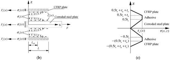 Schematic diagram of stress analysis for the interface between CFRP plate and corroded steel plate: (a) composition of the double-lap joint, (b) interfacial stress distribution along the bond length, and (c) interfacial shear-stress distribution along the specimen thickness direction.