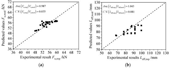 Comparison between predicted values and experimental results of (a) bond strength and (b) effective bond length.