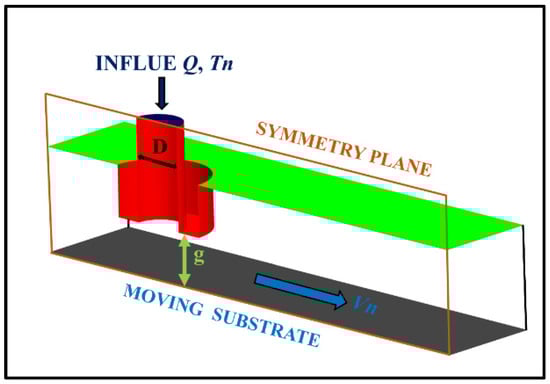 The effect of printing parameters on deposition quality was studied in detail by the numerical method in this paper. Nozzle velocity (, defined by the substrate velocity boundary) and nozzle temperature (, defined by the nozzle temperature boundary) were adopted as the two key control variables to characterize the computational model. The velocity of the substrate was set as 30, 40, and 50 mm/s, respectively. The temperature of the nozzle and the extruded material was set as 180, 200, and 220 °C. The initial temperature of the air was set as 25 °C, the feed rate of melt PLA/GNPs nanocomposite was fixed at 5.024 , and the temperature of substrate was kept at 25 °C. The z-axis gap between the nozzle and the substrate is g (0.4 mm), which could be considered as the layer thickness. The printing parameters of the numerical model are given in Table 1.