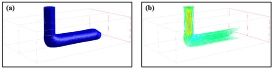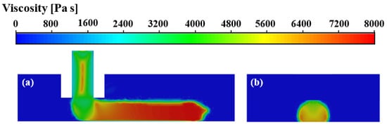 The viscosity fields of the deposited nanocomposite filament are presented in Figure 7. The viscosity depends on the temperature and shear rate. It is clearly observed that the viscosity variation in the deposited filament closely corresponds to the temperature distribution, indicating that the viscosity is sensitive to the temperature. The viscosity value reaches its maximum at the bottom right of the front end of the deposited filament, and the bottom is larger than the top in the horizontal direction, as shown in Figure 7a. The viscosity is much lower in the filament adjacent to the nozzle outlet. The result indicates that there is a lower temperature and a higher shear rate at the bottom right of the front end of the deposited filament than that at the top back end. In the lateral direction, it is observed that the viscosity at the bottom and side wall of the filament is higher than that of the center and top, as shown in Figure 7b. It reveals that there is more heat transferred away from the deposited hot filament to the substrate than to the surrounding cold air. Meanwhile, the thermal convection on both sides of the deposited filament intensifies the heat transfer between the side wall of the filament and the surrounding air, resulting in temperatures at the bottom and side walls of the deposited filament being lower than that at the center and top.