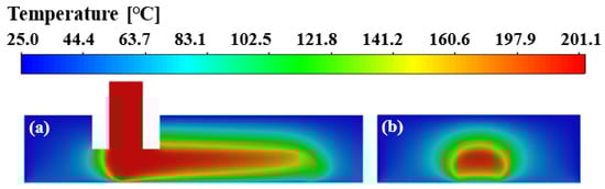 The temperature depends on the heat transfer. Inside the printing chamber, the heat is added by the deposited nanocomposite and transferred away from the deposited hot filament to the surrounding cold air and substrate by heat conduction and thermal convection. To better study the effect of heat transfer on temperature of the deposited filament and surrounding air, the temperature field in the computational domain was examined. Figure 5a,b show the temperature fields of the deposited nanocomposite melt in the x–z plane and the cross-section at x = 0.6 mm, respectively. It can be clearly seen that the ambient air around the deposited filament is heated and its temperature increases significantly, forming a thermal effect zone consistent with the shape of the deposited filament. Due to the relatively low thermal diffusion rate compared to the nozzle velocity, it takes some time for the heat to fully diffuse to the surrounding area when the nanocomposite is deposited on the substrate. Therefore, when the temperature at the front end of the deposited filament almost drops to the solidification temperature, there is still a high temperature in the inner central region.