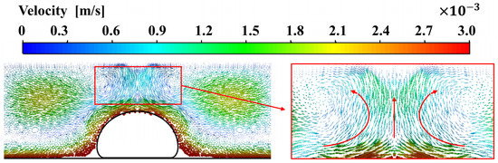 Due to the movement of the deposited filament and the buoyancy caused by the temperature gradient, there is bound to be heat convection effect in the air around the filament, as shown in Figure 6. It can be seen that the hot air rises near the top of the hot filament, while the cold air in the distance flows down from the top of the domain, forming vortices in the relative motion path of hot and cold air on both sides of the deposited filament.