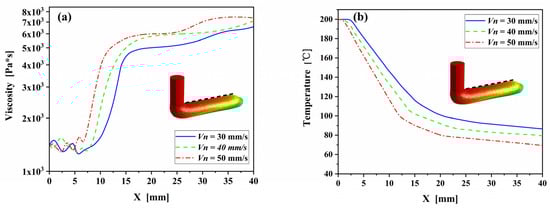 To examine the role of the process parameters on temperature and viscosity of the deposited filament, the changes of temperature and viscosity along the upper surface of the deposited filament were extracted from the numerical results, as shown in Figure 8. As confirmed in the previous section, the temperature decreases and the viscosity increases along the deposition direction, intensely in the initial stage while slowly in the end section. With the increases of nozzle velocity, the sharp change in temperature and viscosity decreases from x = 17 mm with nozzle velocity of 30 mm/s to x = 12 mm with nozzle velocity of 50 mm/s. It indicates that the increase of nozzle velocity is favorable to the heat transfer between the fuse and its surroundings, accelerating the solidification of the filament.