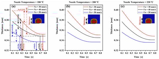 Evolution of the thickness of the deposited filament cross-section with time at different nozzle velocities in simulations: (a) nozzle temperature = 180 °C, (b) nozzle temperature = 200 °C, and (c) nozzle temperature = 220 °C.
