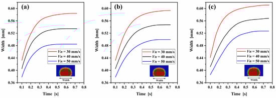 Evolution of the width of the extruded filament cross-section with time in simulations of different nozzle velocity: (a) nozzle temperature = 180 °C, (b) nozzle temperature = 200 °C, and (c) nozzle temperature = 220 °C.