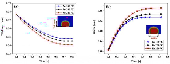 (a) Thickness and (b) width of the extruded filament versus time for three different nozzle temperatures with nozzle velocity of 40 mm/s.