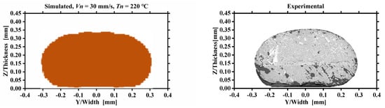 In this part, morphology and dimension of the deposited nanocomposite filaments predicted by numerical simulations were compared with an experimental procedure under different printing parameters. Nine PLA/GNPs nanocomposite filament specimens were extruded by CreatBot DE Printer (Henan SuWei Electronic Technology Co., Ltd., Henan, China). After printing, the nanocomposite filaments were cut perpendicular to the printing direction and the cross-section morphologies were observed by the scanning electron microscope (SEM). The computational and experimental contours of the filament cross-sections were extracted from numerical simulation results and SEM morphologies analyzed by using an open-source image processing software, ImageJ. The thickness, width and the mean area of the filament cross-section were calculated by the threshold slicing algorithm. Examples of the contours and the dimension of the filament cross-section from the computational and experimental morphologies are shown in Figure 12. The computational morphology (Figure 12a) and the experimental SEM morphology (Figure 12d) are processed to a binary black-and-white image with only black and white colors by appropriate thresholding, as shown in Figure 12b,e. The contours of the filament cross-section were extracted and the thickness, width, and the mean area were measured from the binary black-and-white image, as shown in Figure 12c,f.