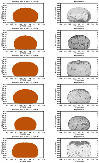Qualitative comparison of the simulated (left) and experimental (right) cross-section morphologies of deposited nanocomposite filaments extruded with different printing parameters.