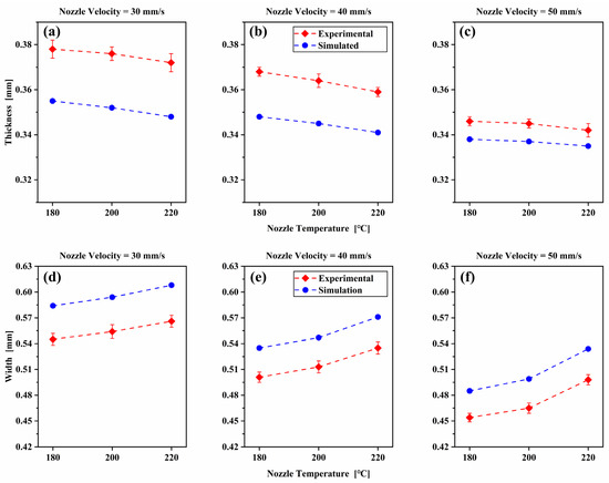Comparison of the simulated and experimental thickness (a–c) and width (d–f) of the deposited nanocomposite filament cross-section for different printing parameters.