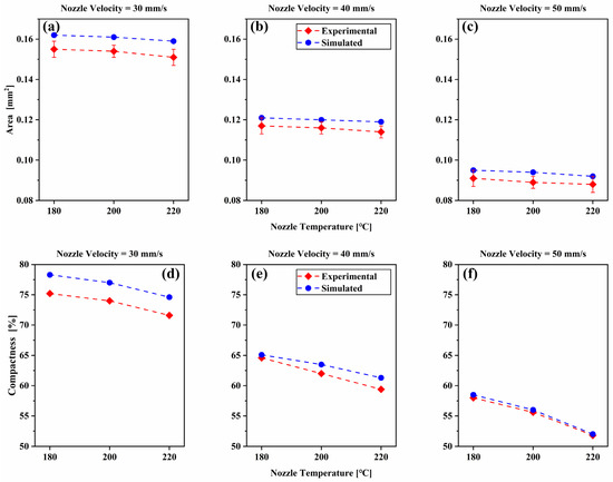 Comparison of the simulated and experimental area (a–c) and compactness (d–f) of the deposited nanocomposite filament cross-section for different printing parameters.