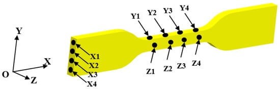 The uniaxial tensile tests of the specimens were performed on an electronic universal testing machine (CTM 8010, XieQiang Instrument manufacturing, Shanghai) equipped with 10 KN load cell. The tests were conducted at a fixed loading rate of 5 mm/min according to ASTM standard. The dimensional accuracy of printed part can be characterized by calculating the standard deviation of the sample size [49]. The dimensional data are obtained by measuring the surface dimensions in X-dimension, Y-dimension, and Z-dimension of the specimens with a vernier caliper. Four points on each surface of the specimens were selected to measure the dimensions and calculate the standard deviation. The arrangement of the measuring points is shown in Figure 16, and the corresponding dimensional data is shown in Table 4.