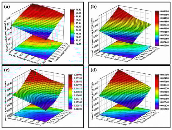 As seen from Figure 17a, the specimens at the upper-left corner of the plot have excellent mechanical properties and tensile strength greater than 61.8 MPa, while in the bottom-right corner of plot, the specimens exhibit low mechanical properties and the tensile strength less than 52.1 MPa. In the high-strength printing region, the corresponding nozzle temperature is greater than 205 °C, nozzle velocity is greater than 38 mm/s. This result indicates that the increase of the nozzle velocity and nozzle temperature increases the tensile strength of the printed specimens, and the maximum tensile strength could be raised by 18.6%. The reason is mainly because the wettability and fluidity of extruded filaments are enhanced under the condition of higher nozzle temperature, which will improve the bonding area and bonding strength of adjacent filaments. In addition, the higher nozzle velocity is beneficial to shorten the curing time of the filament, reduce the forming time interval of the successive layers, thus enhancing the interlayer and intralayer bonding strength and tensile strength of FDM prints. In the contour plot, it can also be seen that the selection window of nozzle velocity is larger than that of nozzle temperature to achieve higher tensile strength, which indicates that nozzle temperature has a more sensitive and significant effect of on the strength of FDM printed sample than nozzle velocity.