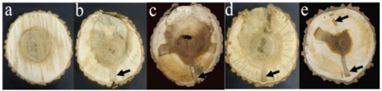 Macroscopic pictures of the cross section of Populus euramevicana discs (a) for the unmodified poplar disc, (b–d) for the 1, 10, 100 mmol/L TEOS injection group and (e) for the SiO2 colloid modified poplar disc. The black arrow represents the injection pore.