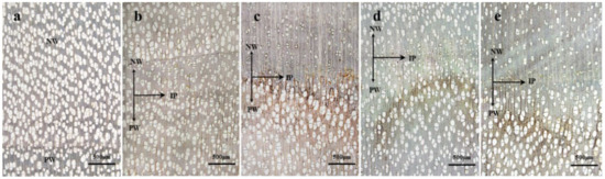 Cross section of poplar (4×), (a) for the unmodified treatment group, (b–d) for the 110,100 mmol/L TEOS modification treatment group, and (e) for the SiO2 colloidal modification treatment group. PW for previously grown wood, IP for injection point, NW for newly grown wood.