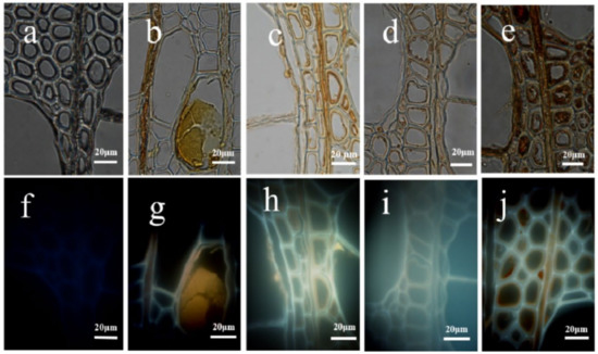 Optical and fluorescence photos of the poplar cross section under different treatment conditions. (a–e) are optical images, and (f,j) are fluorescent images; (a,f) for the unmodified treatment group, (b,g,c,h,d,i) for the 110,100 mmol/L TEOS modification treatment group and (e,j) for the SiO2 colloidal modification treatment group.