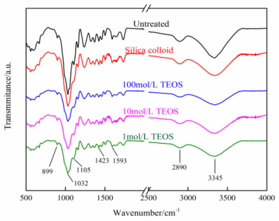 The FTIR in Figure 6 indicated that, when the slow-release drip was conducted on the standing tree, it would form the wood/inorganic composites. The absorption peaks of the untreated samples were mainly caused by the vibration of functional groups on cellulose, hemicellulose and lignin in wood. The bands at 3345 cm−1 and 2890 cm−1 were assigned to O-H stretching vibration and C-H stretching vibration, respectively. Both the O-H and C-H groups were present in cellulose, hemicellulose and lignin. The band near 1730 cm−1 was assigned to the C=O stretch vibration of the acetyl or carboxylic acid groups, which were mainly associated with hemicellulose in wood tissue. The bands at 1593 and 1510 cm−1 were known as the characteristic vibration of the benzene ring skeleton from lignin. It was not easy for other bands at the “finger region” (1400–500 cm−1) to receive a qualitative analysis because these chemical groups might be associated with whole polymers in the wood cell wall. Compared with wood tissue in the untreated tree, the infrared spectra of the new wood inorganic composites had absorption peaks at similar positions, but the intensity for all the absorption peaks declined, indicating that the inorganic substances generated after treatment did not chemically react with the cell wall of the wood to form new chemical functional groups. With the TEOS concentration increasing, the intensity of the main absorption peaks underwent a slight decrease.