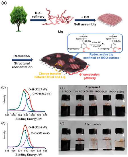 where the Q/QH2 transformation of the RGO-bound lignin could store and release two electrons and protons while charging and discharging, respectively, in aqueous acidic solutions. Thus, two electrons and two protons were stored in a structure containing 6 C atoms and 2 O atoms, giving a charge density of 2 Faraday/108 g, equal to 1787 C g−1 or 496 mA h g−1 [31]. Ye et al. demonstrated that lignin could be employed as a green reductant when preparing RGO through the deoxygenation of GO sheets, and then as a morphological guiding agent in the construction of three-dimensional (3D) RGO-derived composites [32]. Because π–π interactions with lignin hindered the aggregation of the RGO sheets, the RGO solution generated in the presence of lignin was more stable than those obtained using common reductants (e.g., ascorbic acid) (Figure 3d,e). The RL composite produced through hydrothermal carbonization had a large specific surface area, high conductivity, high specific capacitance (190 F g−1 at 0.5 A g−1), and excellent cycling stability (86.5% retention of capacitance after 10,000 continuous cycles of galvanostatic charging/discharging).