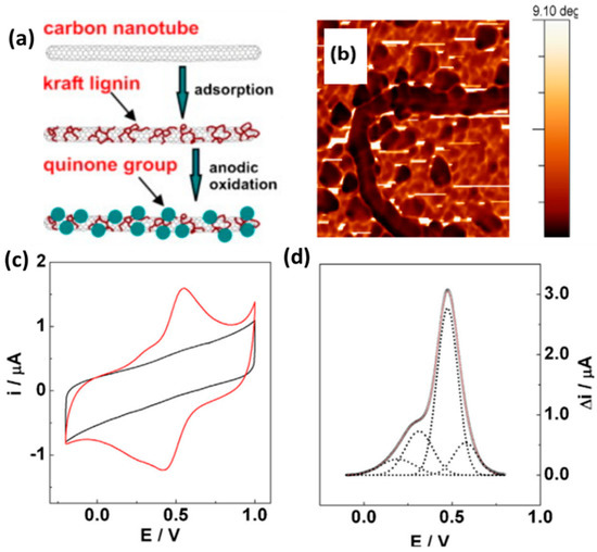 Carbon nanotubes (CNTs) interact through π-stacking with polymers containing aromatic moieties. Milczarek et al. prepared multi-walled CNTs surface-functionalized with KL and studied their electrochemical characteristics (Figure 5a) [31]. The lignin-modified nanotubes readily dispersed in an organic solvent (DMSO) and aqueous ammonia (0.1 M), yielding black solutions; such solutions did not form with unmodified CNTs. Atomic force microscopy (AFM) of the CNT/KL nanocomposite revealed debundling of the CNTs, as well as densely packed globular structures on the surfaces of the individual CNTs (Figure 5b). The redox behavior of the CNT-supported biomolecules was persistent and reversible, due to the KL-derived Q units (Figure 5c). The mass-specific capacitances (Cm) of the unmodified and KL-functionalized CNTs, determined from their CV curves, were 75 and 143 F g−1, respectively. Figure 5d displays the anodic differential pulse voltammogram of the composite, deconvoluted into four Gaussian curves representing oxidation processes occurring at different redox centers. The complex character of the lignin suggests that these curves originated from Q units experiencing different chemical environments. Peng et al. assembled a high-performance, biomass-based, flexible, solid-state supercapacitor featuring a lignin/single-walled CNT (SWCNTHNO3) hydrogel as flexible electrodes and a biocompatible cellulose/Li2SO4 gel prepared using a simple phase-inversion method as an electrolyte separator [38]. The supercapacitor exhibited good specific capacitance (292 F g−1 at 0.5 A g−1), superior rate capability, and a remarkable energy density (17.1 W h kg−1 at a power density of 324 W kg−1). Moreover, the pressure-sensitive characteristics of the biomass-based, compressible supercapacitor were outstanding, with its shape being completely recoverable (i.e., without plastic deformation) after performing a compression cycle.
