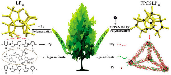 Admassie et al. added phosphomolybdic acid (HMA, H3PMo12O40·nH2O) to the PPy/lignin composite to improve its specific capacitance even further [48]. The inclusion of HMA boosted the specific capacitance of the PPy/lignin composite from 477 to 682 F g−1 (at 1 A g−1) and greatly enhanced the charge storage capacity (from 69 to 128 mA h g−1). Notably, the biopolymer and the inorganic acid dopant both required an acidic electrolyte medium (0.1 M HNO3) to ensure that protonation occurred during the reduction process as well as for the development of the reversible redox activities of each dopant. Zhang et al. used in situ polymerization of pyrrole in a lignin/pyrrole solution to develop an integrated, mechanically stiff, all-in-wood supercapacitor featuring a lignin/PPy hydrogel embedded in the wood [49]. Taking advantage of the high pseudocapacitance of lignin, strong interactions between lignin and wood, and the hierarchical porous structure of the wood, featuring vertical channels, the as-prepared integrated lignin/PPy-wood supercapacitor displayed a high areal capacitance (1062 mF cm−2), a high energy density (47.2 µW h cm−2), and favorable cyclic performance. Peng et al. used oxidative polymerization of pyrrole in the presence of lignin to fabricate a lignin/PPy hydrogel (LP54) [50]. To enhance its mechanical strength and electrochemical performance, they introduced functionalized porous carbon nanospheres (FPCS; prepared through the hydrothermal treatment of porous carbon nanospheres) and pyrrole into the prepared LP54 system prior to oxidative polymerization of pyrrole, thereby obtaining an FPCS/lignin/PPy hydrogel (FPCSLP54, Figure 7). Because of its porous structure and functionalization with pyrrole, the FPCS was anchored and distributed uniformly within the lignin/PPy framework. Although the LP54 sample exhibited high specific capacitance (409 F g−1 at 0.5 A g−1), that of the FPCSLP54 hydrogel was even higher (538 F g−1) when measured at the same current density. Symmetric flexible supercapacitors constructed using the FPCSLP54 hydrogel (electrodes) and a biodegradable cellulose hydrogel (electrolyte separator) exhibited mechanical flexibility and excellent electrochemical properties.
