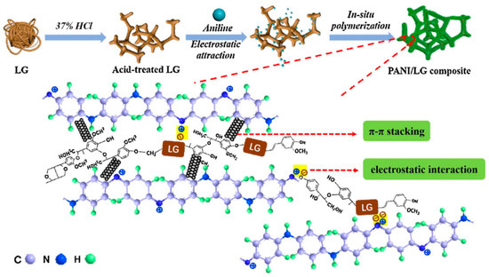 Schematic representation of the mechanism of formation of the PANI/lignin composite and the possible interactions among its components. Reprinted with permission from ref. [53]. Copyright 2019 Elsevier.